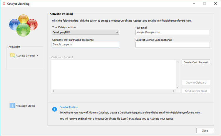 - Fill in the details: The Catalyst Edition you have purchased, your Email address and your Company name.