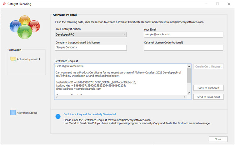 The Certificate Request field will be populated with the computer's Installation ID details ready to send to info@alchemysoftware.com