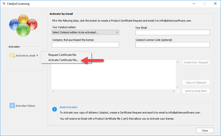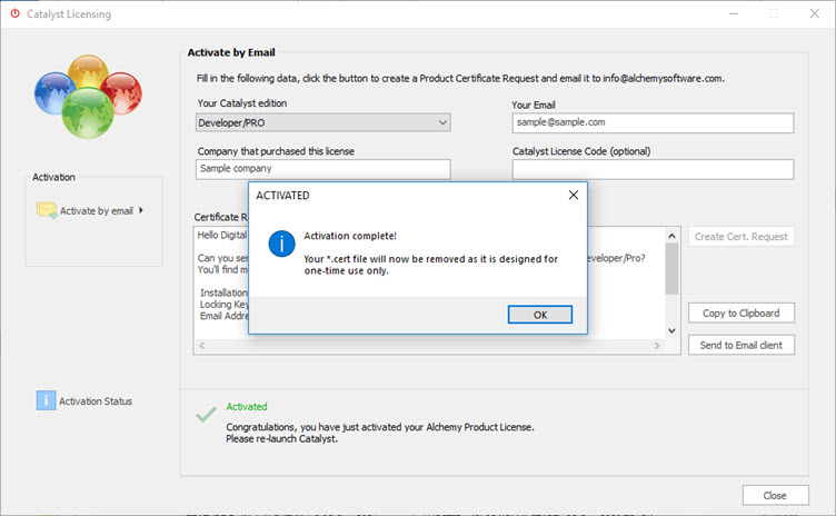 This process generates a license file on your computer using a certificate file issued by Alchemy Software.
