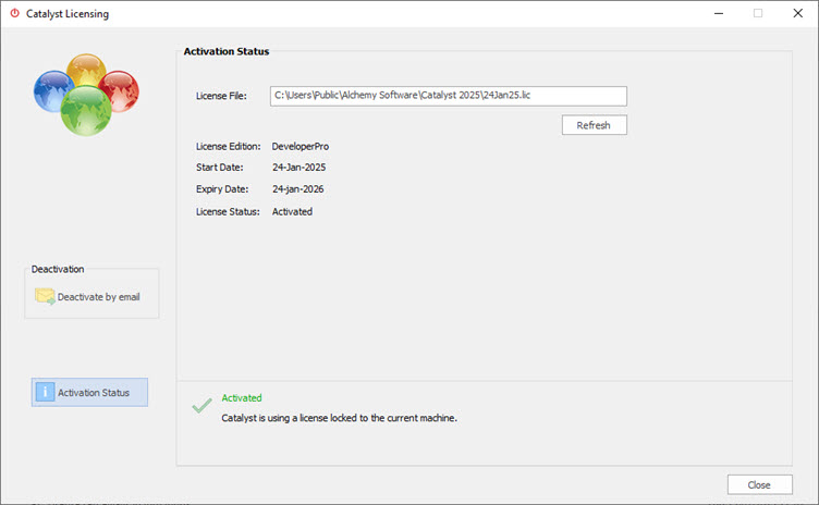Starting CATALYST, in the Alchemy Catalyst Evaluation dialog click on Activate Purchased License