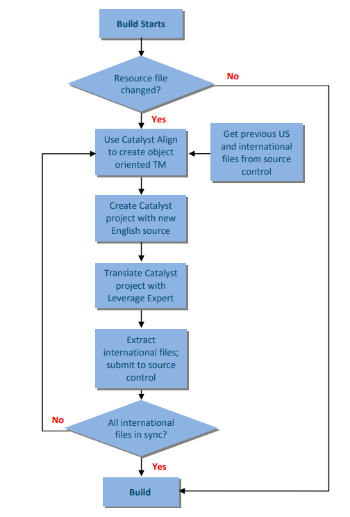 CATALYST's object-oriented TM and id-based matching can be used to accurately leverage multi-lingual content into the development environment, enabling fully automated localized builds, eliminating build breaks due to out-of-sync files.