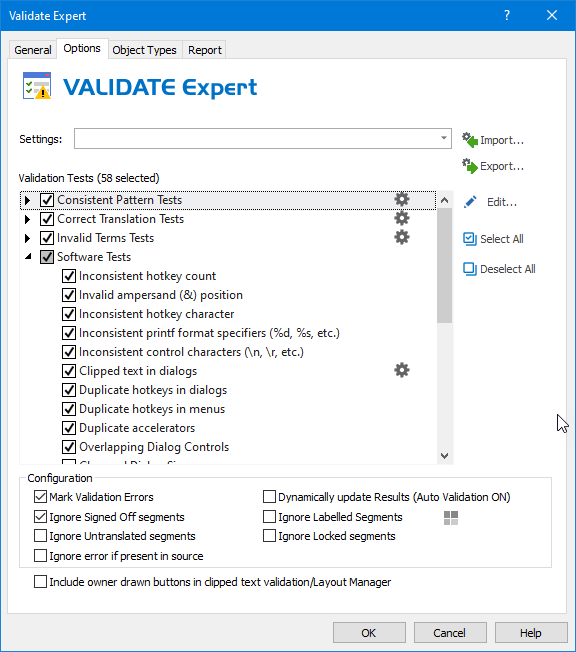 The Validation Expert performs similar tests but across many segments at the same time. It's a productivity feature that checks the integrity of all segments in a file or ttk.