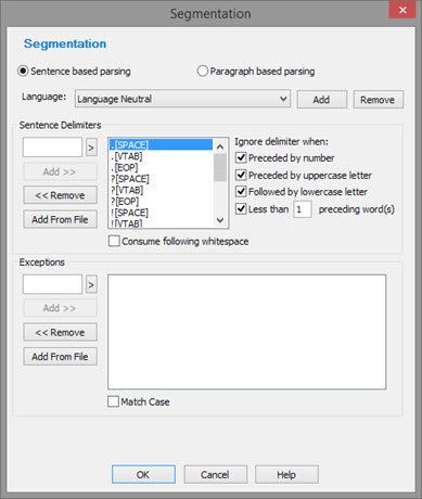 Abbreviated words or anagrams may occasionally cause the segmentation engine to misinterpret a sentence boundary. This can be avoided by specifying any sequence of characters that are to be ignored when applying segmentation rules.