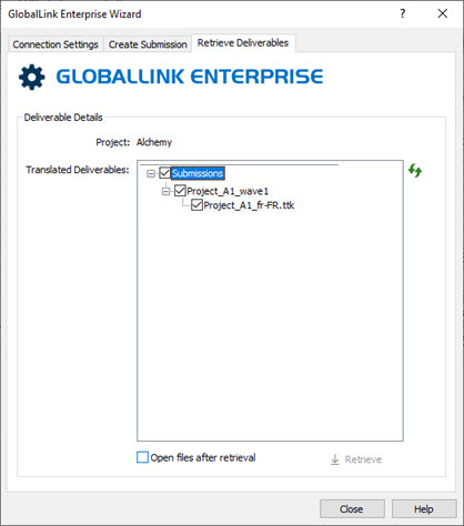 With a connection to the GlobalLink Enterprise server established, access the translated resources in the Retrieve Deliverables tab of the GlobalLink Enterprise wizard.