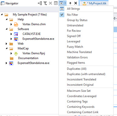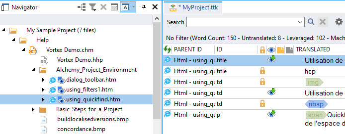 (CTRL+Alt+A), all strings found under the selected resource or folder (recursively) are displayed in the String list (Workspace window). Thus clicking on resources in the Navigator will automatically refresh the string list.