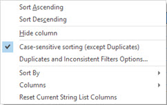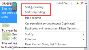The string list can be sorted by any of the column displayed. Click the desired header to sort by Ascending order and click again to sort by Descending order. Alternatively, right click the header and select Sort Ascending or Sort Descending.