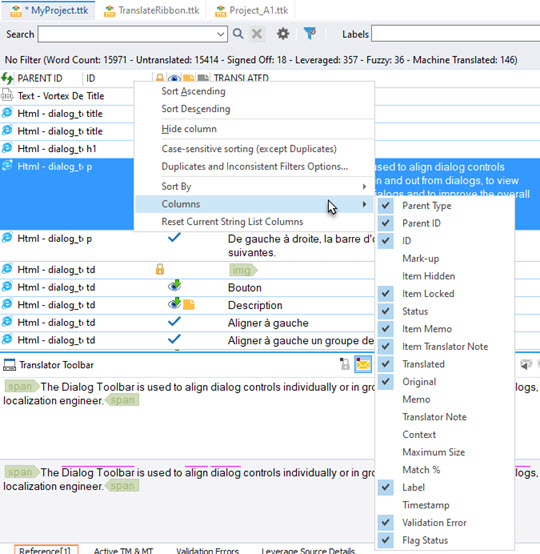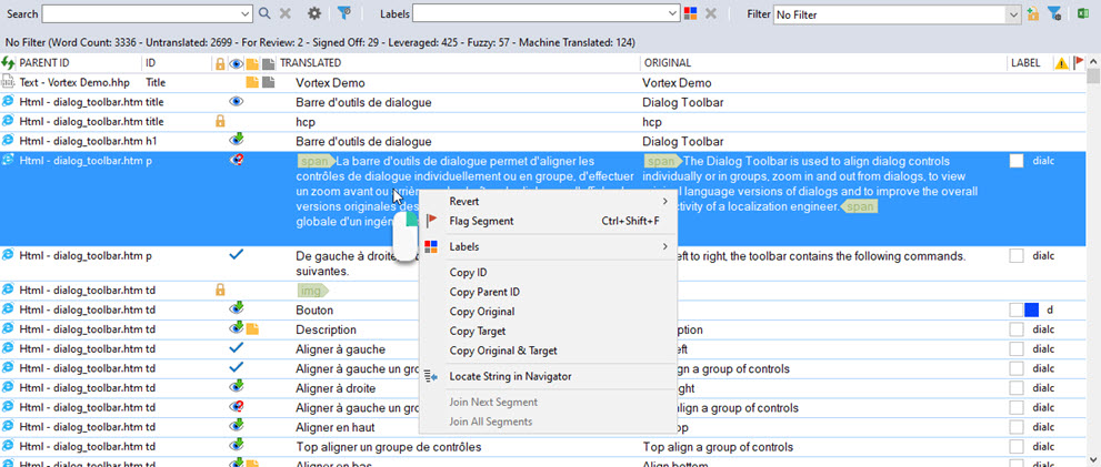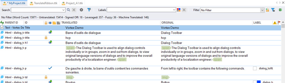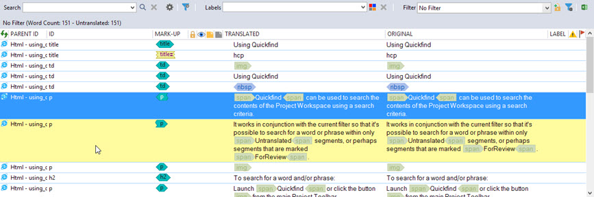 The Project Workspace is where project localizable elements are displayed and worked on. This tabbed window also allows you to quickly change your active project and to use Quickfind, Labels and Filters to locate and organize segments.