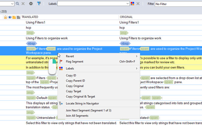 For files which have been segmented on insertion in the project (See Segmentation Rules), selecting a segmented string will also highlight (in yellow) its associated segments. In other words, you see all the segments part of the original parsed string.