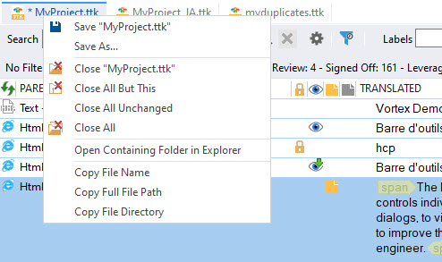 Right click on the project tabs to access the most common tasks such as Saving or Closing projects.