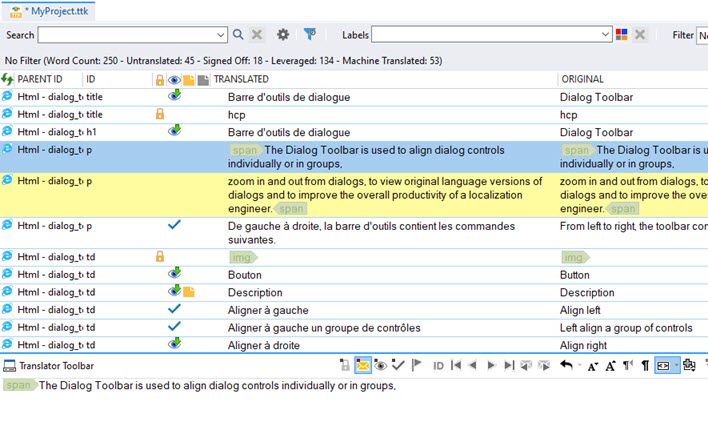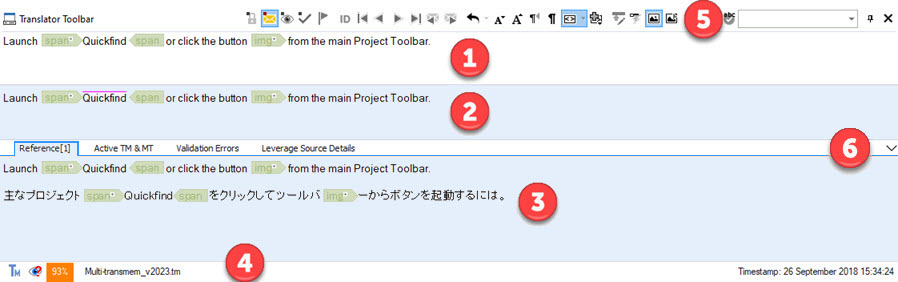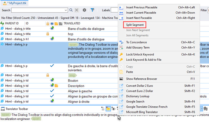 Manipulate and access translator toolbar powerful features, including navigating through the segments. |