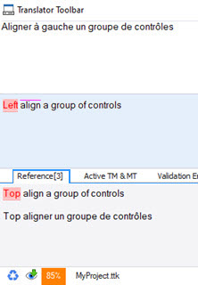 In the reference tab, the source segment is above the translated segment which is the opposite to the translator toolbar source and target fields. This is so that the source segments are above one another to facilitate comparison. The font and alignment are the same for quick visual assessment and any difference is highlighted in red. |