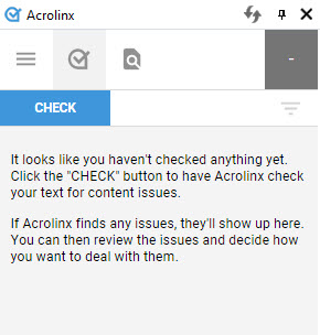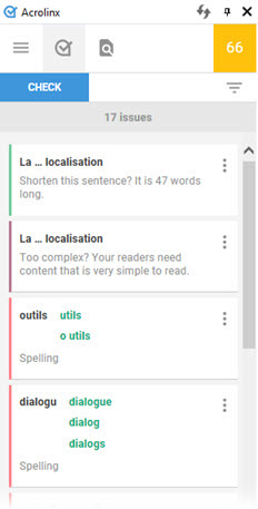 Acrolinx content optimization software evaluates text against standards for terminology, spelling, grammar, style, tone of voice and SEO (search engine optimization). This powerful translation validation tool is integrated in CATALYST using its Sidebar technology. By default, the Acrolinx Sidebar is located to the right of the CATALYST main window and, as with all CATALYST windows, can be repositioned and docked anywhere. See View Ribbon if the tab is not displayed.