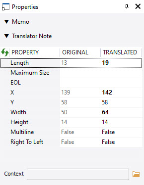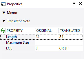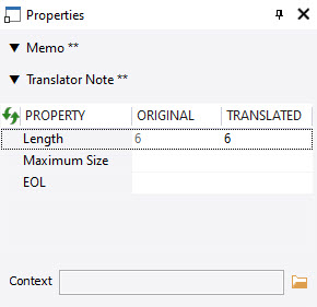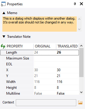 This window is also where users may assign additional properties (also known as MetaData) in the form of Memo, Translator Note, Context link and Maximum size.