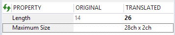 Maximum size applied on the translation are displayed in this PROPERTY table. In this example, a maximum size of 28 characters on 2 lines is set: