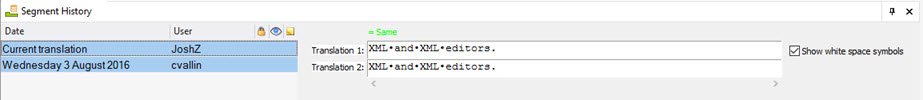 Show white space symbols: Toggle to display space characters as a dot symbol. This makes space characters more visible, particularly when comparing differences between two history entries of a segment. |