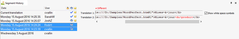 When multiple entries are listed in the Segment History, press and hold the CTRL key to select 2 segment histories you wish to compare. The Translation 1 and 2 fields will display the 2 segments highlighting any difference in red. This includes space character differences which may not be evident until you select the "Show white space symbols" option.