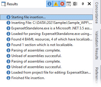 button. This is located in the top right hand corner of each pane. Once a pane is minimized, it will dismiss itself from the screen and automatically dock itself at the bottom or side of your screen. In the example below, the Results window is visible, however the Concordance, Validation Results and Reference browser windows are docked on the right hand side of the screen.