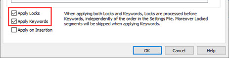 Use Apply Locks & Keywords to automatically apply locks and keywords in a Project using the rules in the selected file. Keywords are words or phrases within a segment that should not be modified, e.g. company names. Keywords in Catalyst are marked with a blue background.