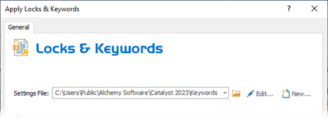 Rules to apply Locks & Keywords are based on the selected Settings File. The default location for this file is the Alchemy Public Folder: "C:\Users\Public\Alchemy Software\Catalyst 2023\Keywords.xml".
