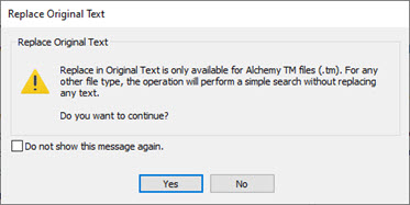 Although it is not possible to change the Original segments in CATALYST Projects (.ttk), the Find and Replace functionality can modify the Original segments within .tm files only. This enables users to make necessary updates to their Translation Memories should this be needed. For example a tag name or word has changed in the updated files for translation and this causes many Fuzzy matches when leveraging translations. Making the change using Find and Replace in the Translation Memory directly could eliminate the need to review Fuzzy match results.
