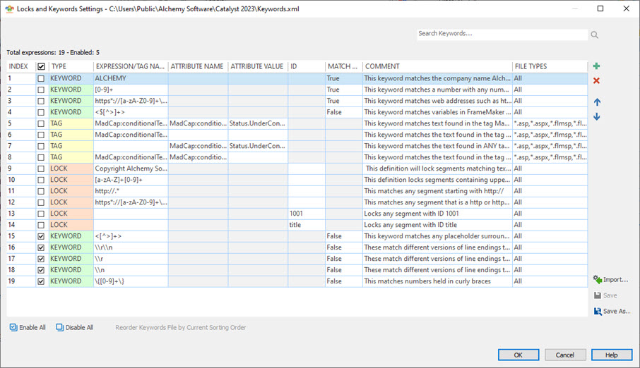 The default location for the keywords Settings File is the Alchemy Public Folder: "C:\Users\Public\Alchemy Software\Catalyst 2023\Keywords.xml". Learn more on Customizing Locks & Keywords settings here.