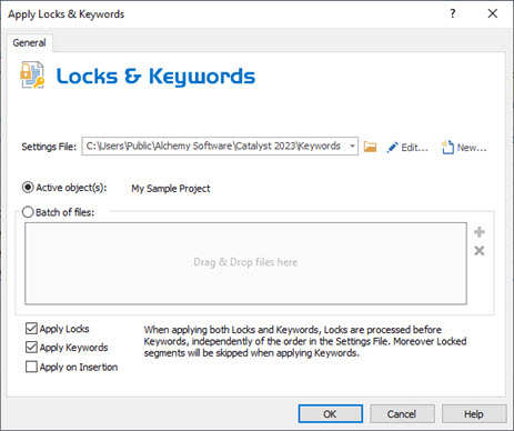 A powerful way to use this feature is with Apply on Insertion selected. When selected Locks and Keywords will be systematically applied to all files as they are inserted into your TTK projects. Learn more on Apply Locks and Keywords here.