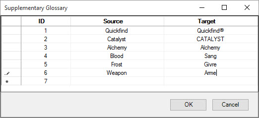On the >* line, click source and target cells to add a new term and its translation to the supplementary glossary.