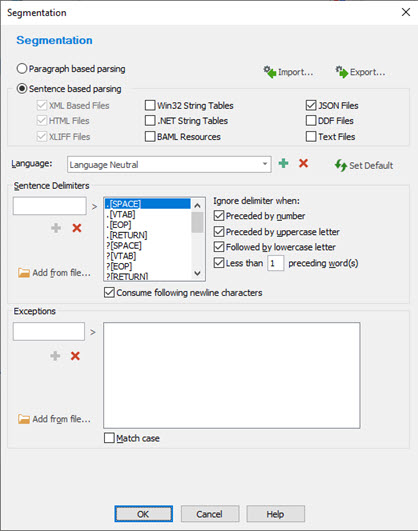 By default, rules listed under Language Neutral will apply to ALL files parsed into your projects, regardless of the source language set. You can Add a language to the dropdown and set different segmentation rules applicable to that source language only. Those rules will only apply to projects with the matching source language.