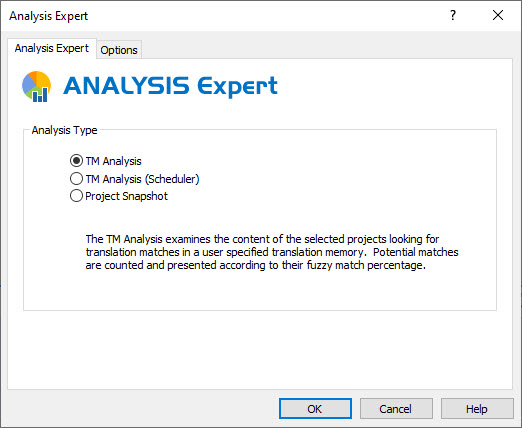 The Analysis Expert analyses one or more projects by comparing them to a translation memory to calculate the number of segment matches between the projects and the Translation Memory. A word count report is created using this Expert. This report can then be used by the project manager and/or translator to create a time line and costing for a translation project.