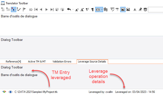 When leveraging a segment and an acceptable match is found in the TM, information about that TM entry is stored along with the current segment in the CATALYST project. You can always refer to this information to know about the TM entry that was used for any leveraged segment.
