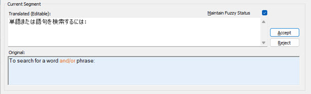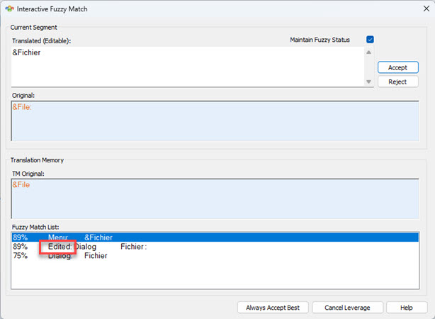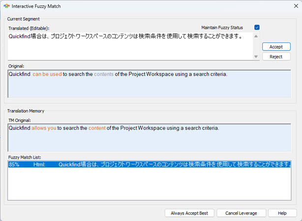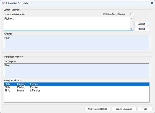 Click the Accept button to apply the Current Fuzzy match or Reject if you wish to ignore the match and move to the next segment.