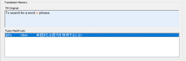 Fuzzy Match List This window displays a list of fuzzy matched segments from a Translation Memory. It displays the calculated fuzzy match as a percentage value along with the type of object matched in the Translation memory.