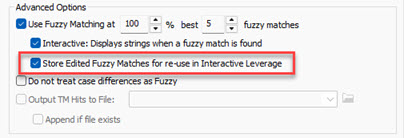The Interactive Leverage Fuzzy Match dialog is used by professional translators to select appropriate translations from a Translation Memory. This dialog will be displayed when Fuzzy Match is selected and one or more matches have been located in a Translation memory. The difference between the segment in the TM and the current segment are highlighted in color. To learn more about Fuzzy Match Colors, please refer to Fuzzy Match Colors.