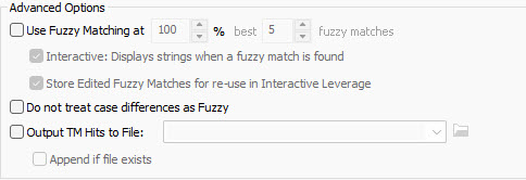 Select this option if you want all your fuzzy matches stored in an external TMX file. This file can then be dispatched to your external translator so that they can review all fuzzy matches themselves. This switch is useful is an Engineer wants to pre-translate only 100% exact matches and leave all fuzzy match translations to a qualified translator. |