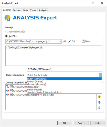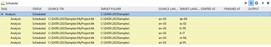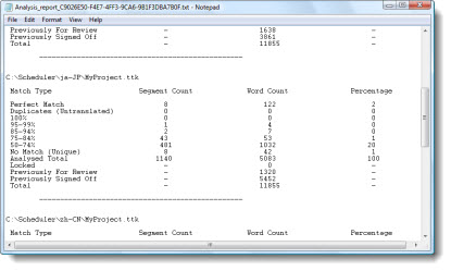 Scheduled Analysis uses a Job File and analyses one or more projects by comparing them to multiple translation memories to calculate the number of segment identical and fuzzy matches. A word count report is created using this Expert. This report can then be used by the project manager and/or translator to create a time line and costing for a translation project.