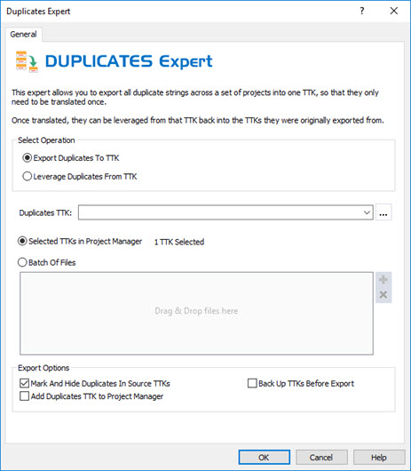 Use the Duplicates Expert to extract and consolidate duplicated segments across several TTK projects. Translating all the duplicates from a number of TTK projects will ensure consistency of translations. The output is a new TTK file in which the gathered duplicates are exported to.