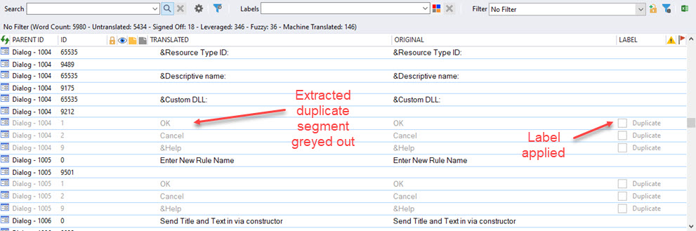 Example, TTK project exported to Duplicates with the option "Mark and Hide Duplicates in Source TTKs" selected.