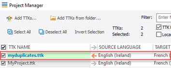 Selecting this option automatically lists the newly created Duplicates TTK to the Project Manager list, marked selected.