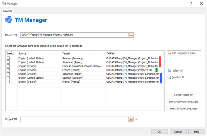If you define the Output TM the same as the Master TM with the intension to add languages to your TM, it is good practice to click Select Master TM button so you do not mistakenly omit a language pair. As this would result in losing it. |