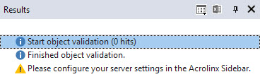If no user is Signed In within the Acrolinx Sidebar, running this validation test will output a warning in the Results window.