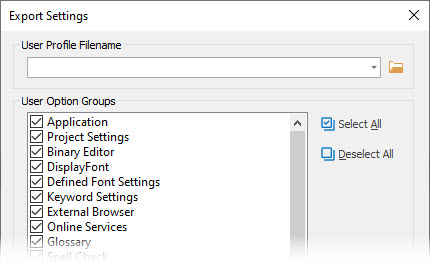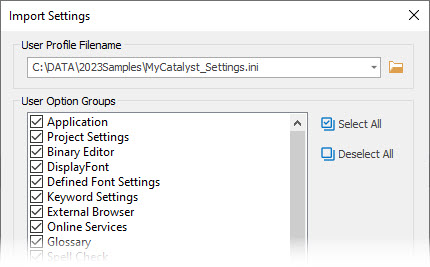 User Profiles are used to store configuration information for Alchemy CATALYST. A User Profile (named Settings file) is an text based file that contains all the default and custom settings of Alchemy Experts, Glossary files, Active Translation Memories and other configuration options available for Alchemy CATALYST. They can be shared throughout a project team to ensure that everyone has similar environment settings.