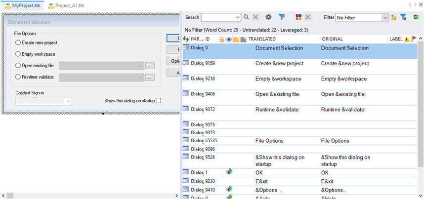 A visual representation of a project item will be displayed in the workspace pane. There are several Visual View editors include dialogs, images, menus, XML and HTML derivatives. |