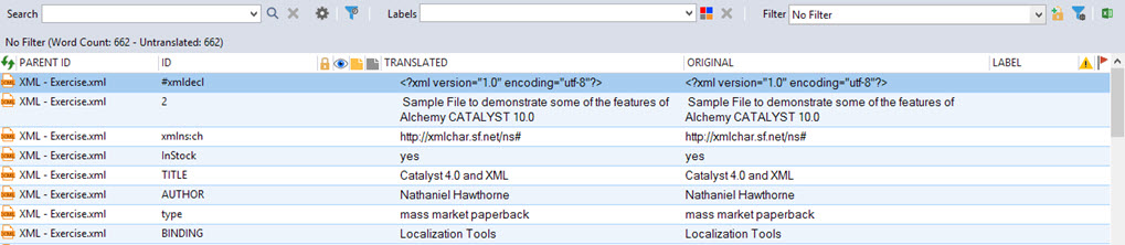In this view the engineer can change the text elements of the XML document as well as attributes and their values. However, Alchemy CATALYST ensures that the structure of the file cannot be altered or damaged in any way. This ensures that the file integrity is maintained throughout the localization workflow, which is essential in reducing the impact on testing and engineering. |