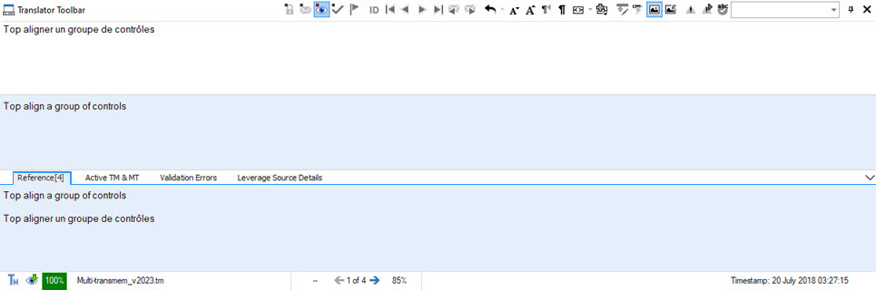 Translation Memories (TM) and Machine Translation (MT) sources can be used as translation sources to find and display suggested translations in the Translator Toolbar. Several TM and MT sources can be active simultaneously and suggested translations from these locations will be displayed in the reference pane of the Translator Toolbar. To open a Translation Memory and view translations: