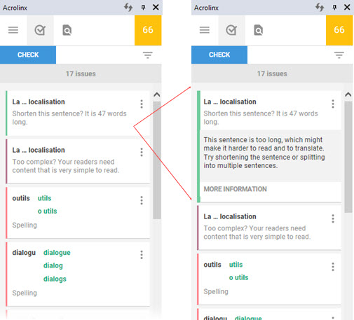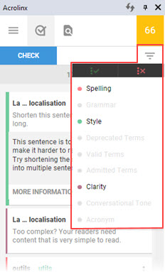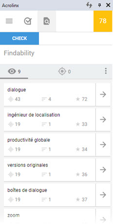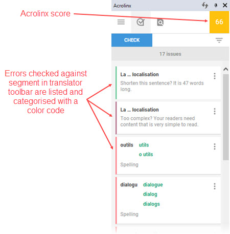 The Acrolinx Sidebar enables evaluating translations against standards for terminology, spelling, grammar, style, tone of voice and SEO. It tests the currently selected segment editable in the Translator Toolbar window by clicking the CHECK button.