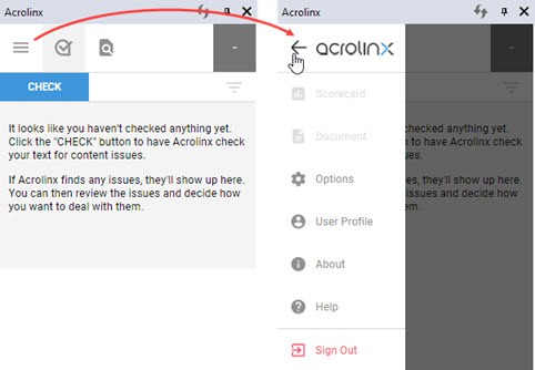 Click the hamburger button in the sidebar to access the Acrolinx menu.