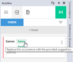 For some errors, such as spelling and grammar, the issue lists out correct alternatives in green. Clicking on them will immediately change the text in the Translator Toolbar.